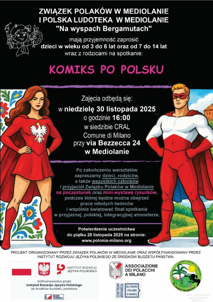 W minioną niedzielę, 30 listopada Związek Polaków w Mediolanie, we współpracy z Ludoteką „Na Wyspach Bergamutach” miał przyjemność gościć członków naszej polskiej społeczności w Mediolanie na wyjątkowych warsztatach i spotkaniu integracyjnym: “Komiks po polsku”. Jesteśmy dumni, że udało nam się stworzyć wydarzenie, w którym dzieci mogły rozwijać swoją kreatywność, a dorośli poznać innych Polaków i zawrzeć nowe znajomości. Projekt został zrealizowany dzięki dofinansowaniu z budżetu Państwa Polskiego za pośrednictwem Instytutu Rozwoju Języka Polskiego im. św. Maksymiliana Marii Kolbego.