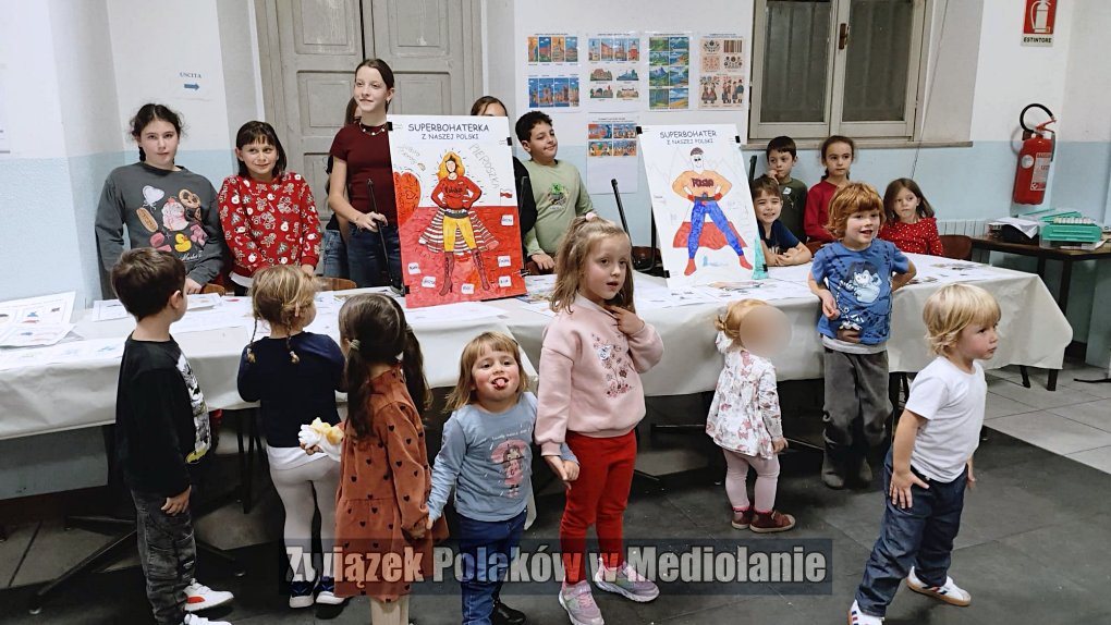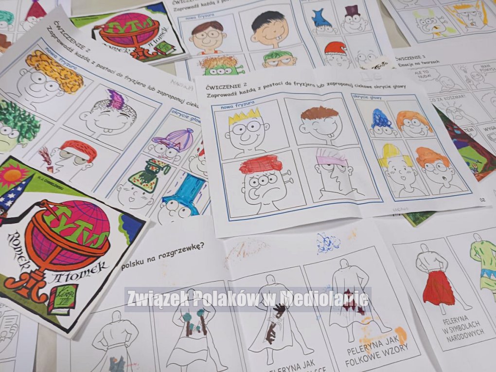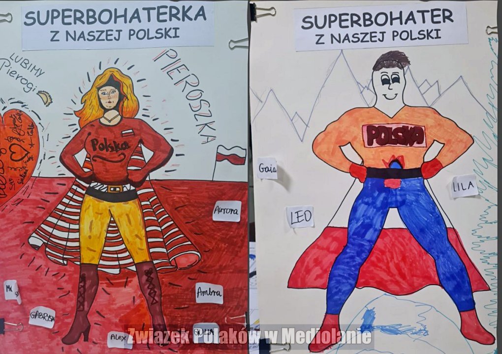 Po indywidualnej pracy twórczej wszyscy młodzi adepci komiksu połączyli siły i zaczęli działać razem, by stworzyć wspólne dzieło: „Super bohaterkę i Super bohatera z Naszej Polski”. To było prawdziwe wyzwanie, ale też wyjątkowa okazja do integracji i dyskusji – oczywiście w języku polskim. Zainspirowani pięknem polskiego krajobrazu, dostojeństwem zabytków, bogactwem kultury oraz siłą folkloru i symboli narodowych, które mogli zobaczyć na przygotowanych planszach, wspólnie powołali do życia oryginalne postaci, po których od razu widać, że pochodzą z Polski. Nie zabrakło na nich urokliwych polskich regionów, takich jak Tatry, Mazury, wybrzeże Bałtyku czy Bory Tucholskie, miast: Lublina, Gdyni i Wrocławia, oraz motywu polskich strojów ludowych, jarmarków i dożynek. W sali stanęła również ilustrowana Mapa Polski. Powstałe dzieła to żywy dowód na ich nieskrępowaną wyobraźnię i zaskakującą znajomość polskich motywów!
