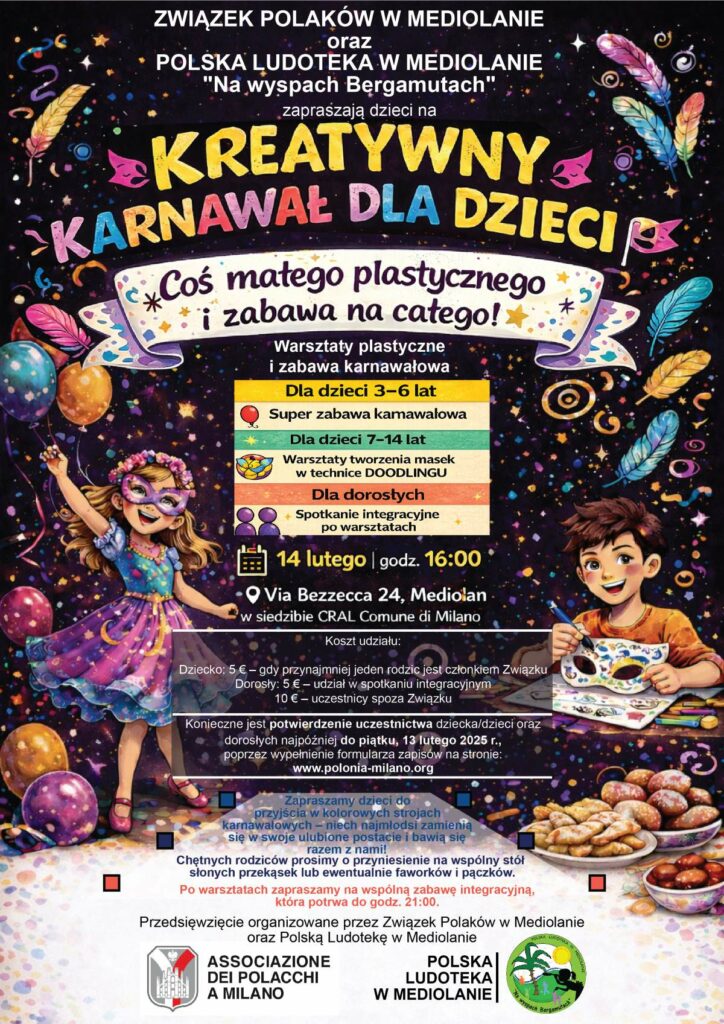 Związek Polaków w Mediolanie i Ludoteka Polska w Mediolanie “Na wyspach Bergamutach” mają przyjemność zaprosić dzieci w wieku 3 – 14 lat wraz z rodzicami oraz dorosłych na: