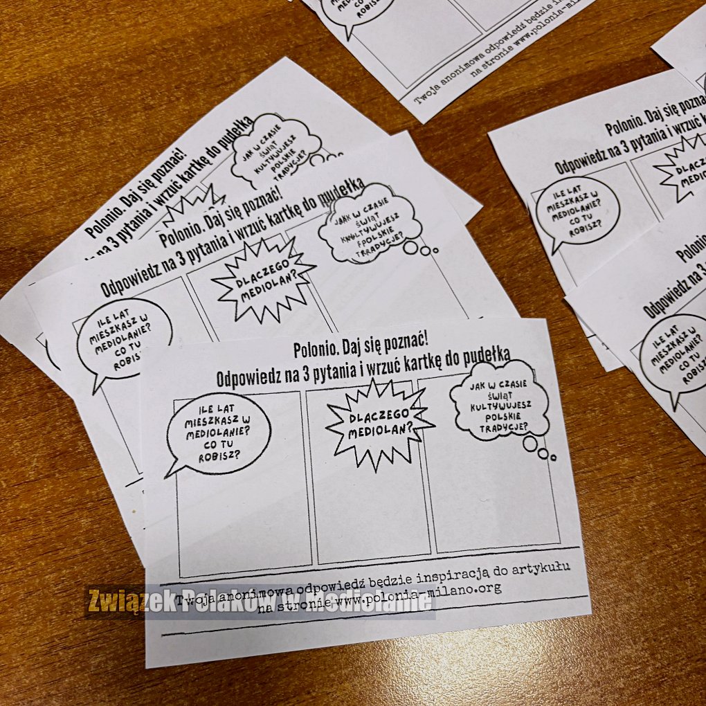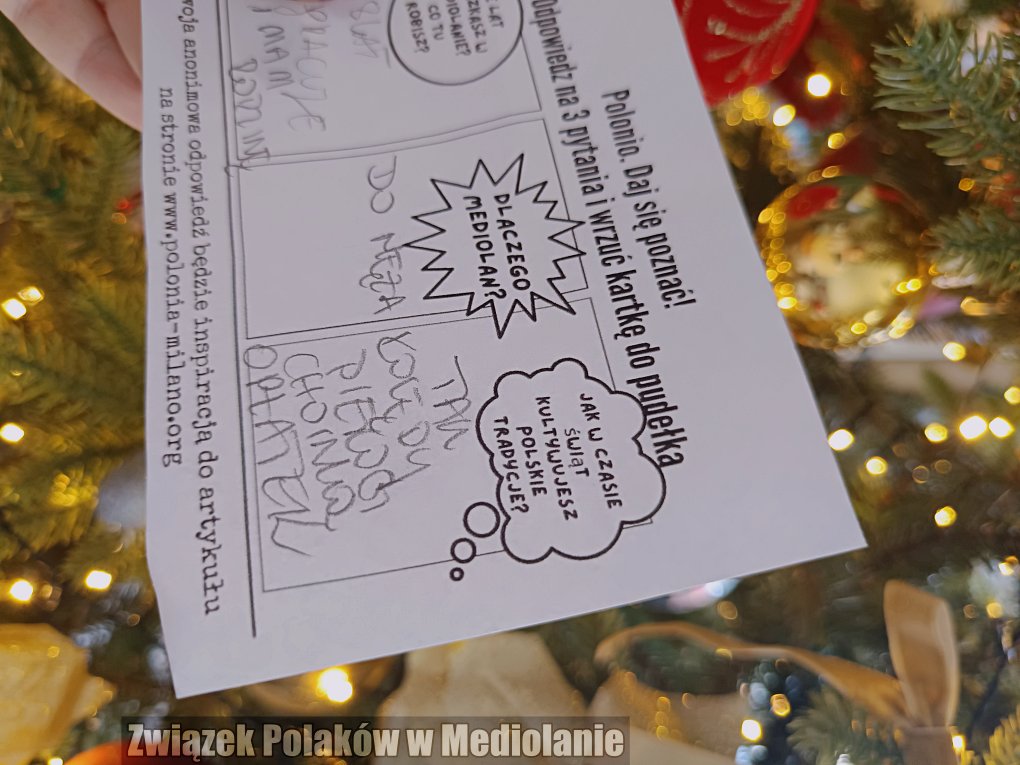 Jako Związek Polaków w Mediolanie od wielu lat niestrudzenie organizujemy wydarzenia, które stały się rytuałami dla naszych rodaków: od uroczystych obchodów rocznic historycznych, przez koncerty, po spotkania i zajęcia dla dzieci. Chcąc lepiej poznać uczestników naszych inicjatyw, podczas ostatniego wydarzenia polonijnego, czyli warsztatów „Komiks po polsku” i spotkania integracyjnego 30 listopada, postanowiliśmy nieco uatrakcyjnić wydarzenie i zwrócić się bezpośrednio do Was, Polaków w Mediolanie, by przeprowadzić bardzo prostą mini-ankietę. Na sali, gdzie odbywały się warsztaty stanęło pudełko z napisem: POLONIO. DAJ SIĘ POZNAĆ! Uczestnicy odpowiadali anonimowo, na specjalnych karteczkach nawiązujących do tematyki spotkania, na trzy pytania w ankiecie, które stały się soczewką skupiającą bardzo ogólny portret osób korzystających z naszych eventów. Ze względu na zbliżające się Święta Bożego Narodzenia chcieliśmy również dowiedzieć się, jak Polacy w Mediolanie kultywują polskie tradycje.