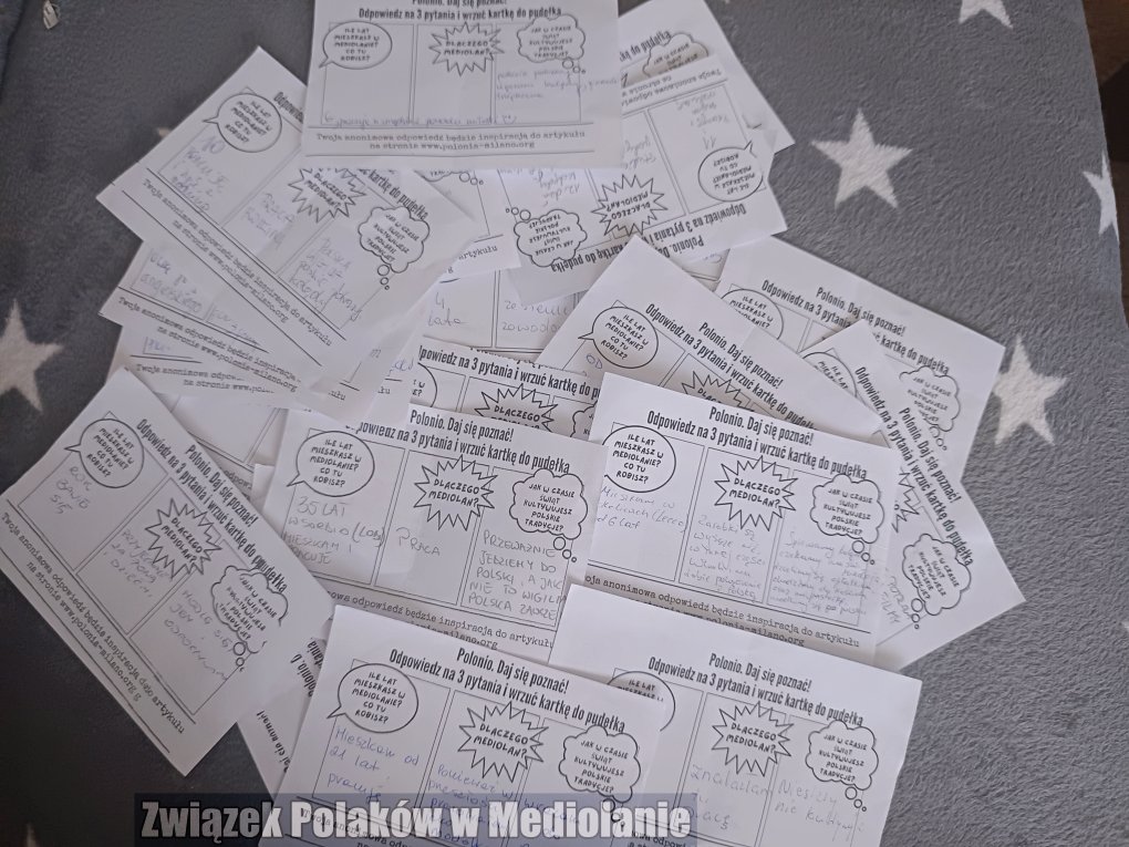 Odpowiadaliście na następujące pytania: Ile lat mieszkasz w Mediolanie? Co tu robisz? Dlaczego Mediolan? oraz Jak w czasie świąt kultywujesz polskie tradycje? W pudełku, do którego trafiły Wasze anonimowe odpowiedzi znaleźliśmy 29 wypełnionych formularzy.