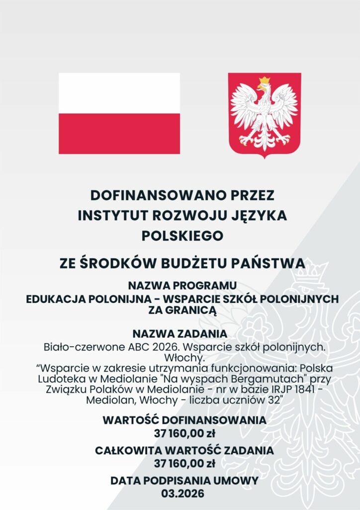 Dofinansowano przez Instytut Rozwoju Języka Polskiego ze środków budżetu państwa w ramach dotacji celowej na podstawie umowy o finansowania z dnia 03.2026 w ramach wykonywania zadania „Biało-czerwone ABC.2026. Wsparcie szkół polonijnych. Włochy” realizowanego przez Fundację Wolność i Demokracja.