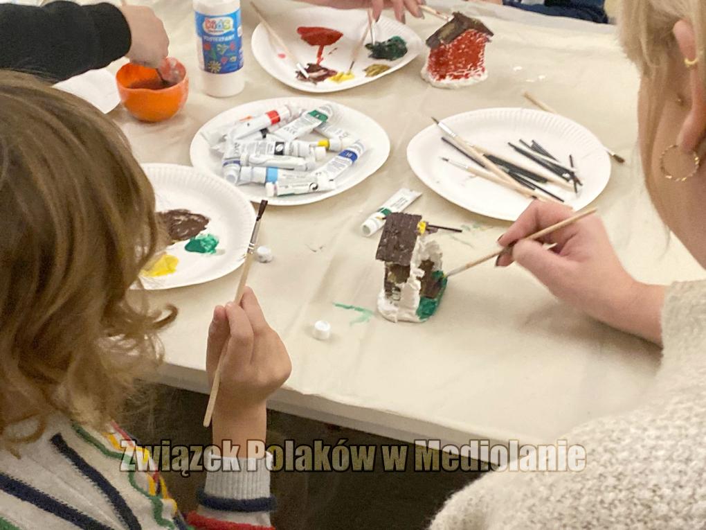 Zajęcia przebiegły w prawdziwie świątecznym klimacie. Na początku, po krótkim wstępie integracyjnym z Panią Agnieszką, dzieci przystąpiły do składania i dekorowania świątecznej choinki. Następnie starsze dzieci wzięły udział w prezentacji na temat tradycji szopkarskiej. Szczególnie miło było wysłuchać doświadczeń rodziców, którzy chętnie włączyli się w dyskusję na temat bożonarodzeniowych szopek w Polsce i we Włoszech. W kolejnej części zajęć uczestnicy mieli okazję zapoznać się z procesem pracy z gipsem i tworzenia odlewów. Dzięki temu mogli oswoić się z tym materiałem oraz dowiedzieć się o nim czegoś nowego. W trakcie warsztatów wspólnie stworzyliśmy szopkę, korzystając z silikonowej formy. Dzieci z wielkim entuzjazmem malowały figurki temperami, tworząc swoje własne, niepowtarzalne wersje bożonarodzeniowej szopki.